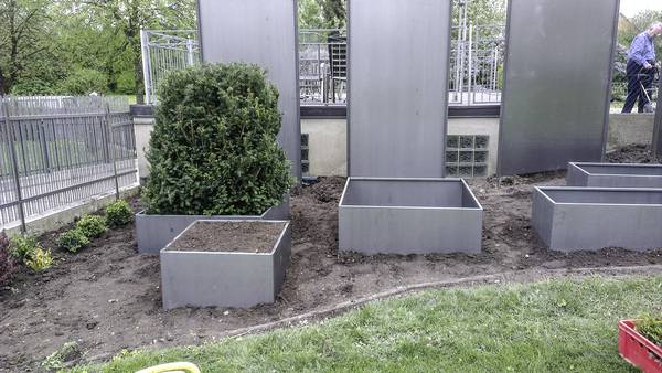 Der vor den Stellwänden liegende 15 m lange Beetstreifen misst unten 3 m Breite, oben 1,50 m. Den unteren Beetteil bestückte Xaver Stark mit Pflanzkästen in unterschiedlichen Größen und Formaten – mal quadratisch, mal rechteckig. Auch hierfür wurde Schwarzblech verwendet und die Seitenteile, die bei allen Kästen gleich hoch sind, wurden miteinander punktverschweißt. Den Buchsbaum am unteren Ende des Beets hat der Spengler-Gärtner zuerst zurechtgeschnitten und anschließend den Pflanztrog drumherum gebaut. Bei den Pflanzkästen dauert die Bewitterung etwas länger als bei den Wänden, aber auch hier werden mit der Zeit Feuchtigkeit und Korrosion ihr Werk tun. Den Blechtafel Sichtschutz Wänden gibt der Metallprofi eine Lebensdauer von drei Jahrzehnten, die Pflanzkästen werden, da sie direkt mit dem Erdreich in Berührung sind, voraussichtlich nach etwa 15 Jahren zu erneuern sein.