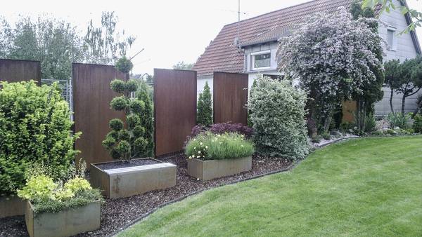 Im oberen Beetteil haben die Starks auf dem dunklen Rindenmulch einige helle Steine locker verstreut und dazwischen neue Pflanzen gesetzt. Die Bäume, die sich schon vor der Umgestaltung dort befanden, durften ihren Platz behalten. Außerdem zieren Lavendel, Rosen, Mini-Ahornsträucher und eine Konifere das Gartenstück. „Zwischen den Stellwänden kann man jetzt mit dem Nachbarn viel besser durchplauschen als vorher“, freut sich Xaver Stark. Trotzdem ist ein gewisser Sichtschutz gewährt. An dem originellen Arrangement werden die Starks lange Freude haben – und Nachbarn und Besucher können sehen, dass Klempner sich auch auf Gartengestaltung verstehen und Metall sich für viel mehr eignet als nur für Regenrinnen.