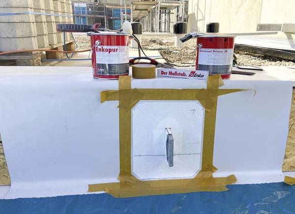 Tobias Backhaus vom Düsseldorfer Enke-Werk schildert es wie folgt: „Einen 10-cm-Abdichtungsflansch auf einer Flächenabdichtung rund um ein Geländerschwert anzubringen ist mit Flüssigkunststoffabdichtungssystemen sehr gut machbar.“ Laut Backhaus liegt die Herausforderung jedoch in der gebauten Wirklichkeit. Denn die Geometrie der Geländerkonsolen gibt am Durchstich eben diese 10 cm häufig nicht her. Der Einsatz der beiden Flüssigkunststoffe Enkopur und Enkolan hat sich auch in diesem komplexen Detailbereich bestens bewährt. Sogar dann, wenn die einzudichtende Fläche an der Konsole nur wenige Zentimeter beträgt.