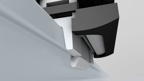 Der Monteur setzt zunächst das Unterteil der Klemme auf den Falz, das durch seine spezielle Geometrie bereits eine gute Montagefixierung bietet und nicht mehr kippen kann. Nach dem Auflegen der PV-Module auf die Anpressgummis des Unterteils wird das Oberteil der Falzklemme aufgesetzt. Es weist wiederum Gummiformteile auf, sodass die Glasmodule beidseitig zugleich elastisch und kraftschlüssig gehalten werden. Das Oberteil besitzt einen Klemmhaken, der sich von unten – und eben nur von unten! – an den umgelegten Falz anlegt. Dadurch gibt es keine seitliche Klemmwirkung auf die Schiebehafte, die deren freies Spiel beim Ausdehnen oder Zusammenziehen der Schare behindern würde. Mit der Innensechskantschraube auf der Oberseite der Klemme werden sowohl die Klemmflächen für die PV-Module als auch der Haken für die vertikale Falzklemmung mit definiertem Drehmoment angezogen und mit nur einem Schraubvorgang fixiert.