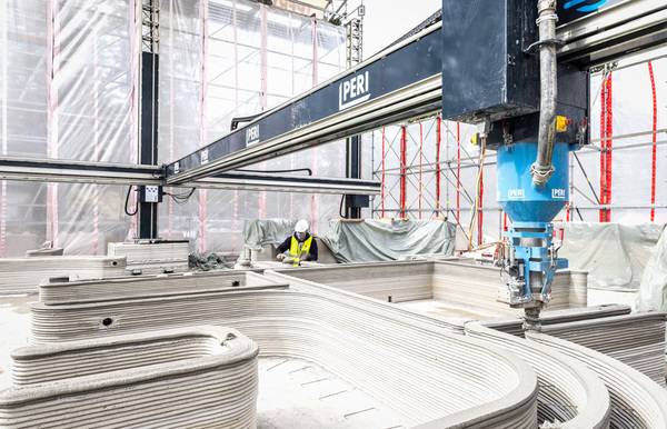 Peri setzt zum Druck 3-D-Drucker vom Typ BOD2 ein. Diese Drucktechnologie stammt vom dänischen Hersteller Cobod, an dem Peri bereits seit 2018 beteiligt ist. "Der in Beckum verwendete Drucker vom Typ BOD2 ist ein Portaldrucker, d. h. der Druckkopf bewegt sich über drei Achsen auf einem fest installierten Metallrahmen", so Fabian Meyer-Brötz, Leiter 3D Construction Printing bei Peri. "Der Vorteil: Der Drucker kann sich in seinem Rahmen an jede Position innerhalb der Konstruktion bewegen und muss nur einmal kalibriert werden."