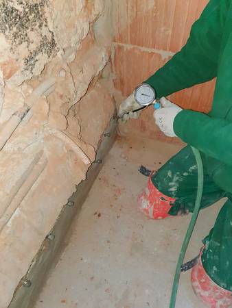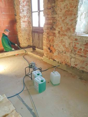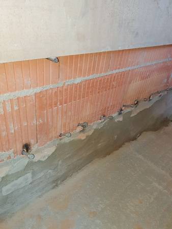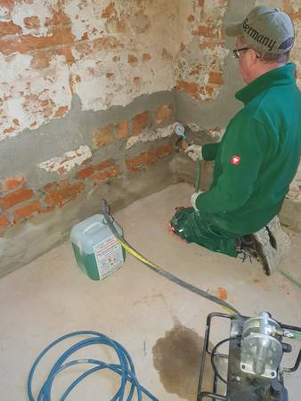 Der Einbau der Horizontalsperre erfolgte an den gesamten Umfassungswänden auf über 53 lfm. Auch Teilbereiche von neu eingezogenen Zwischenwänden wurden behandelt, da diese teilweise auf die historische Gründung gesetzt wurden.