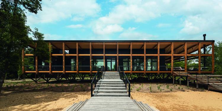 Das Architekturbüro MAPA entwickelte ein amphibisches Hauskonzept: Holzbinder heben das Gebäude zwei Meter über den Boden, um es vor Überschwemmungen zu schützen.