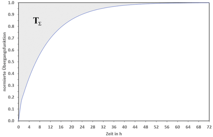 Die Summenzeitkonstante stellt die Summe aller Zeitkonstanten im System dar und kann für ebene Bauteile analytisch aus der sogenannten Kettenmatrix (siehe VDI 6007-1 [5]) oder durch numerische Integration der normierten Übergangsfunktion errechnet werden (Fläche oberhalb der normierten Übergangsfunktion, siehe Abb. 1). Dadurch wird die insgesamt gespeicherte Wärme bei diesem Vorgang berücksichtigt.