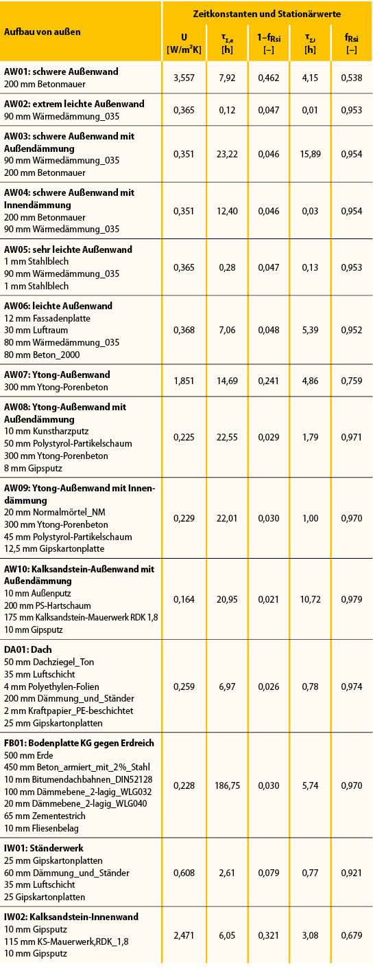 Für die Berechnung der beiden Summenzeitkonstanten von ebenen Bauteilen lässt sich das kostenlose Tool „SZKBauteile.exe“ [6] verwenden. Ein Beispiel für die Simulation ist in der Datei „AW08_Ytong-Außenwand mit Außendämmung.xlsx“ in [6] enthalten. In ihr findet sich auch der Vergleich mit dem Simulationsmodell Zustra (siehe unten). Sie kann als Vorlage für eine Validierung verwendet werden. Die Schichtaufbau-