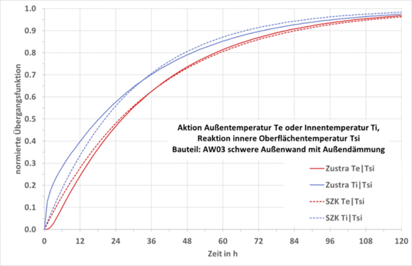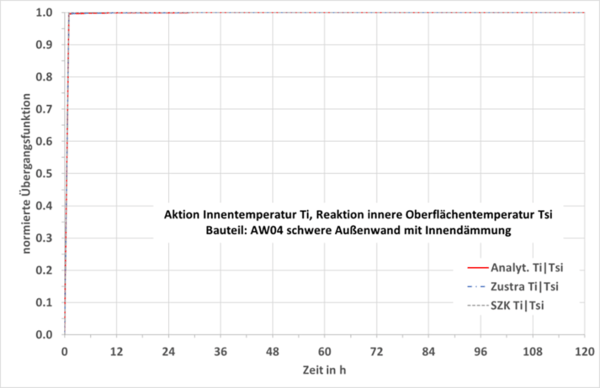 Die auf den stationären Endwert normierte Übergangsfunktion kennzeichnet grafisch das dynamische Verhalten und ist in Abb. 3 und Abb. 4 für eine Außenwand mit Innendämmung und für beide Aktionsgrößen dargestellt. Die rote durchgezogene Linie zeigt die analytische Lösung im Laplace-Bereich durch Multiplikation der Kettenmatrizen und numerische Rücktransformation in den Zeitbereich. Die blaue strichpunktierte Linie ist mit der Zustandsraummethode Zustra berechnet (halbanalytisches Verfahren aus der Systemtheorie, das auch für die thermische Gebäudesimulationen eingesetzt wird). Die grau gestrichelte Linie ist mit dem SZK-Verfahren berechnet.