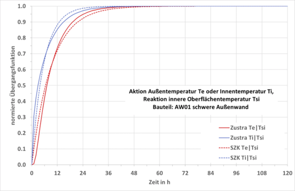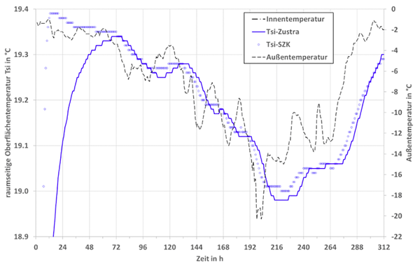 Das SZK-Verfahren ist somit wertetreu bezüglich des stationären Verhaltens und der Gesamtwärmespeicherung bei dynamischen Vorgängen. Es berücksichtigt auch eine außenseitige Aktion, die Einfluss auf die raumseitige Oberflächentemperatur nimmt.