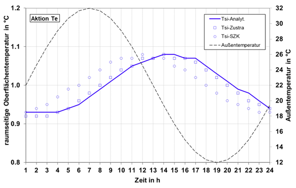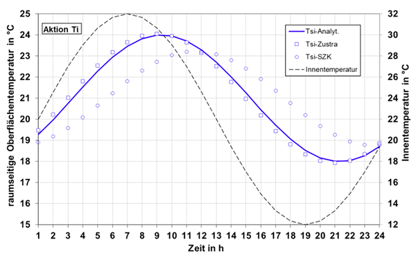 Bei den heutigen Anforderungen an den U-Wert von Außenwänden wird der fRsi-Wert in der Größenordnung von 0,97 liegen. Dementsprechend verringert sich der Einfluss der Außentemperatur, wobei allerdings auch eine höhere Amplitude gegenüber der Innentemperatur zu bewerten ist.
