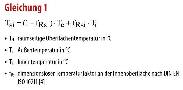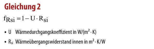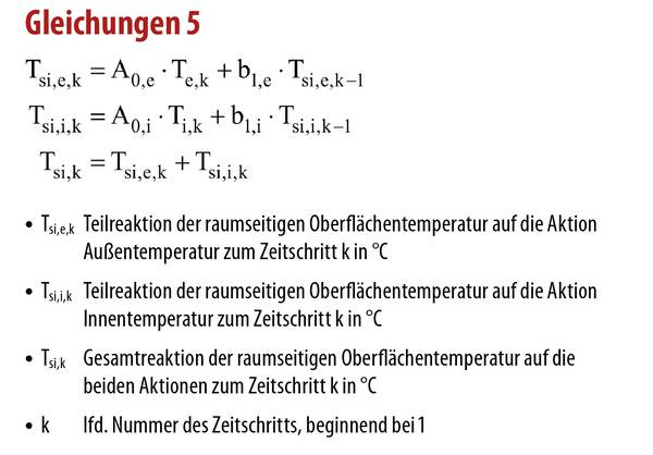 Der fRsi-Wert lässt sich Wärmebrückenkatalogen entnehmen oder mit einem Wärmebrückenprogramm berechnen. Nach DIN 4108-2 [1] muss er seit 2003 für Außenbauteile in Neubauten mindestens 0,70 betragen. Das müsste auch für ebene Bauteile gelten, wodurch ein Mindestwert festliegt. Dann geht nach Gleichung 1 die außenseitige Temperatur zu maximal 30 Prozent auf das stationäre Verhalten bzw. auf den zeitlichen Mittelwert der raumseitigen Oberflächentemperatur ein.