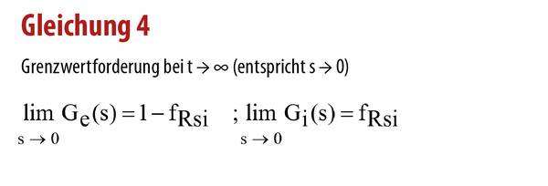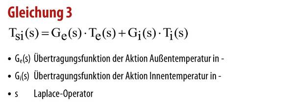Ausgangspunkt dieser Betrachtung ist daher die Berechnung der raumseitigen Oberflächentemperatur eines Bauteils. Im stationären Fall gilt die Gleichung 1. Der fRsi-Wert ist im Zusammenhang mit Wärmebrückenberechnungen bekannt, kann aber auch für ebene Bauteile verwendet werden. Dafür gilt Gleichung 2. Aus den beiden Faktoren vor der Außen- und Innentemperatur ist zu erkennen, dass es zwei Übertragungsfunktionen mit unterschiedlichen stationären Endwerten geben muss. Für den instationären Fall erhält man im Laplace-Bereich Gleichung 3, mit der Grenzwertforderung (Gleichung 4) zur Sicherstellung des stationären Verhaltens. Damit entspricht auch der Mittelwert von periodischen Vorgängen dem stationären Ergebnis.
