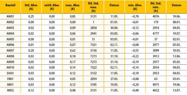 Abb. 11 gibt einen Überblick über die Abweichungen des SZK-Verfahrens von der Zustandsraummethode für die Bauteile aus Abb. 2. Nur die beiden Bauteile AW01 und AW07 mit den hohen U-Werten weisen eine Standardabweichung größer gleich 0,2 Kelvin auf. Alle anderen Bauteile passen sich hervorragend mit einer minimalen Abweichung von -0,22 Kelvin bei AW08 an. Die mittlere Abweichung beträgt aufgrund der oben genannten Wertetreue in allen Fällen 0,00 Kelvin.