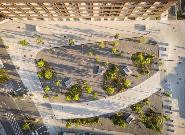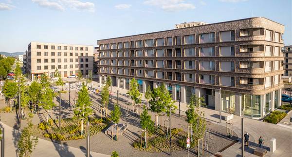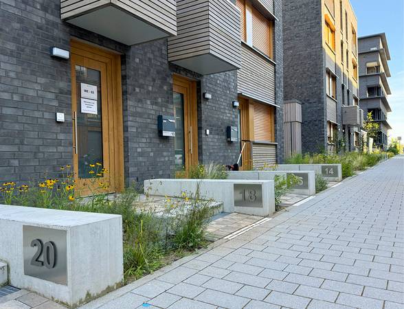 - Das Prinzip der Multicodierung, in dem städtebauliche Elemente eine Doppelfunktion erfüllen, weil beispielsweise der Quartiersplatz mit seinem Stadtwald sowohl attraktiver Treffpunkt ist als auch durch sein kluges Entwässerungskonzept bei Starkregen schützt und zusätzlich das Mikroklima des Quartiers verbessert.