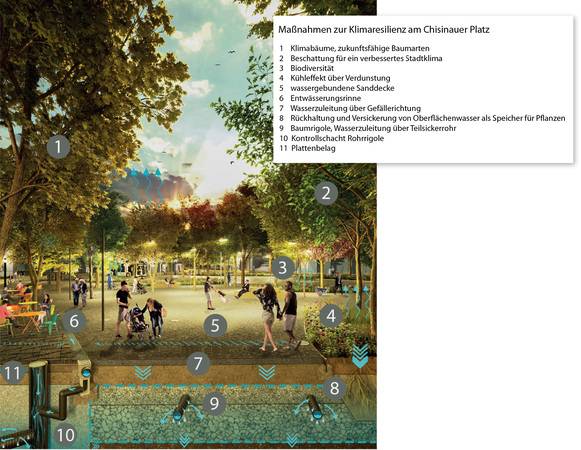 Dennoch erfüllt der Chisinauer Platz bereits jetzt die ihm zugedachten Funktionen für den Umwelt- und Überflutungsschutz: Am tiefsten Punkt sammelt sich der Niederschlag auch bei Starkregenereignissen – und kann durch die wassergebundene Decke nach dem Konzept der Schwammstadt versickern. Das spezielle Substrat speichert das kühle Nass, damit es die Bäume und Staudenpflanzen versorgt oder Verdunstungskühle an besonders heißen Tagen an die Umgebung abgibt – wie eine grüne, natürliche Klimaanlage.