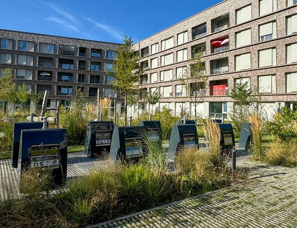 Im Quartier der kurzen Wege mit seinen öffentlichen Freiräumen spielt das Auto schon jetzt keine oder nur eine untergeordnete Rolle. Das verankerte Mobilitätskonzept bietet zahlreiche Alternativen zum privaten PKW, macht zumindest den Zweitwagen überflüssig und den Zuzug insgesamt zu einer bewussten Entscheidung für ein verändertes Mobilitätsverhalten.