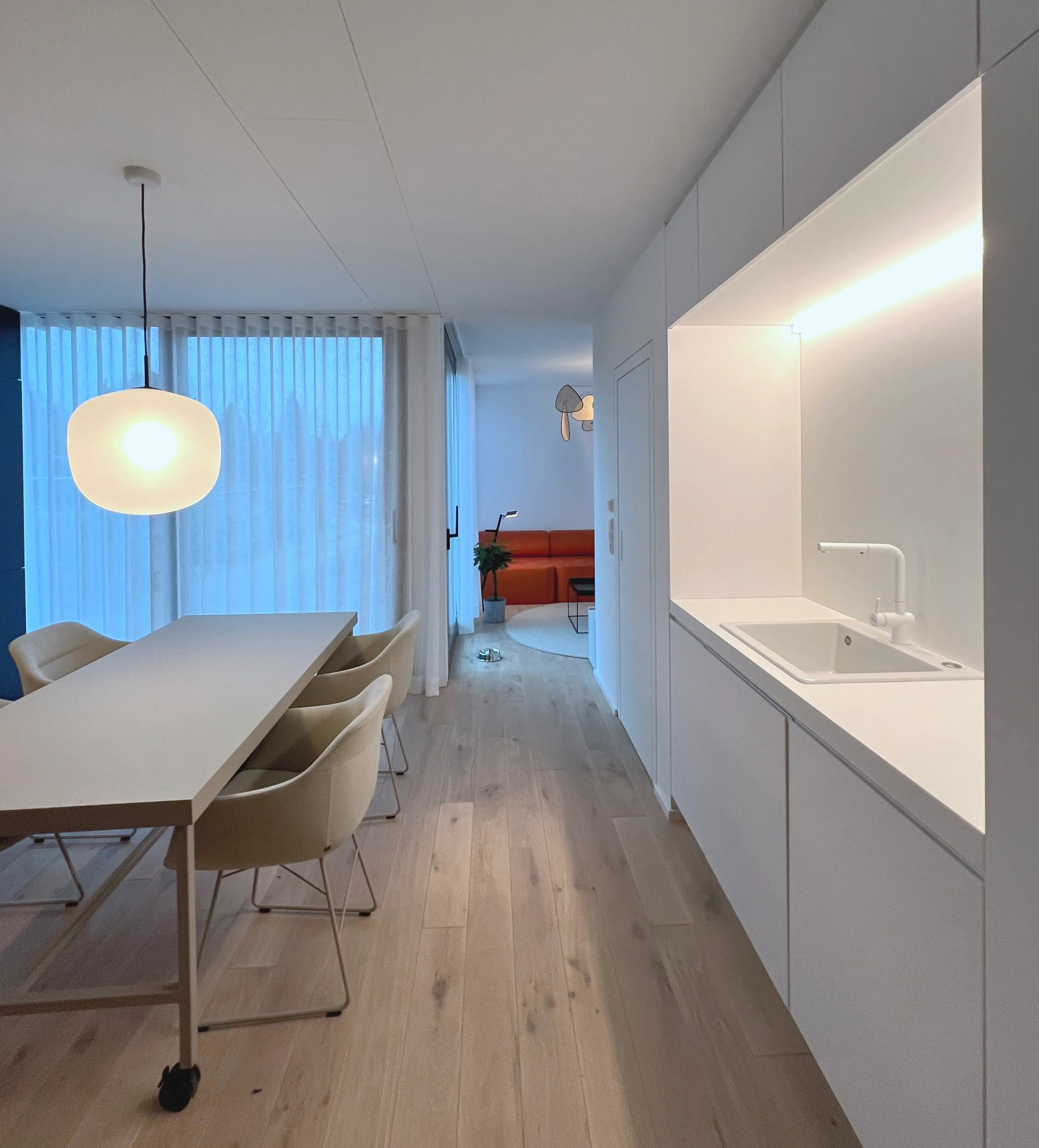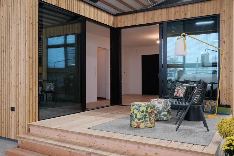 Bislang wurden die Häuser im KfW-55-Standard errichtet, doch mit dem Auslaufen der KfW-Förderung für diesen Baustandard Ende Januar dieses Jahres werden die in Zukunft gebauten T2 nun auf KfW 40 umgeplant. Auf den 47 Quadratmeter Grundfläche im Tiny House sind die Bereiche Schlafzimmer, Küche, Bad, Home Office und Wohnzimmer untergebracht. Auch ein Außenbereich in Form einer kleinen Terrasse ist Bestandteil des Konzepts.