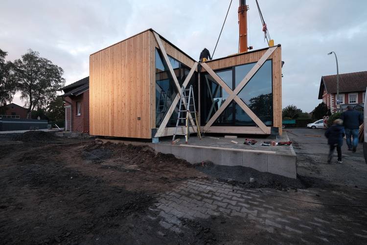 Schöpfer der T2 Tiny Houses bzw. Minihäuser in Harsewinkel ist das Warendorfer Unternehmen Livingunits. T2 ist ihr erstes Modell seriellen Bauens kleiner, eingeschossiger Fertighäuser. Die Tiny Houses werden in Holzrahmenbauweise in Hallen komplett vorgefertigt und dann in zwei Teilen (Module) per Schwertransport zur Baustelle geliefert und dort vor Ort binnen weniger Stunden zusammengefügt. Einen Dachstuhl gibt es nicht im Minihaus.