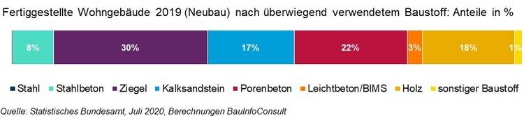 Ein Wandbaustoff gibt im deutschen Wohnungsbau schon seit Jahren den Ton an: der Ziegel. So wurden auch in 2019 fast ein Drittel aller fertiggestellten Neubauwohngebäude mit den roten Mauersteinen errichtet – wie die in der alljährlichen Branchenstudie „Jahresanalyse“ von BauInfoConsult durchgeführte Analyse der statistischen Daten zeigt. Von den vorteilhaften Eigenschaften, die der Ziegel hat, dürften besonders folgende Aspekte die Bauherren überzeugt haben: hohe Verfügbarkeit und Druckfestigkeit, gute wärme- und schalldämmende Eigenschaften, gutes Brandverhalten so wie eine lange Lebensdauer.