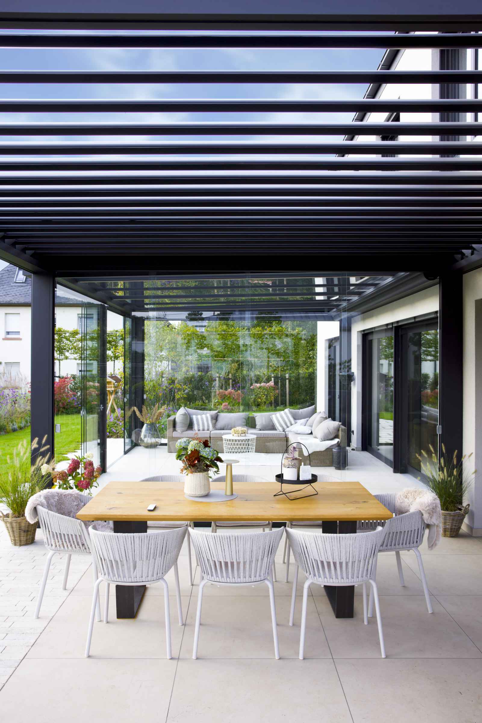 Für die Integration ins Smarthome können die Komponenten beispielsweise über eine Somfy TaHoma Switch per App gesteuert werden. Die bis zu 135 Grad drehbaren Lamellen erlauben eine flexible Regulierung von Licht, Schatten und natürlicher Belüftung – wahlweise per Fernbedienung oder App. Die Planung sollte idealerweise alle gewünschten Komponenten und deren Kabelverlegung berücksichtigen. Alternativ ermöglicht der Eckverbinder „Ausführung B“ auch nachträgliche Erweiterungen.