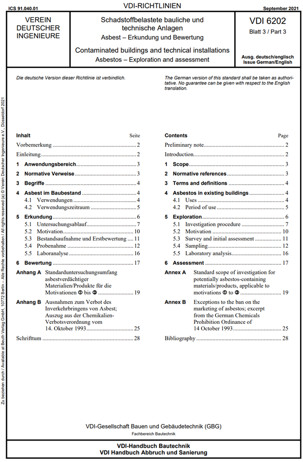Die erste technische Regel zur Erkundung und Bewertung von Asbest in baulichen und technischen Anlagen wurde im September 2021 als Weißdruck veröffentlicht. Bereits 2015 startete ein Gremium des VDI mit der Arbeit an dieser Richtlinie. 6 Jahre später, nach vielen Entwürfen und entsprechenden Korrekturen konnte die Asbestrichtlinie VDI 6202 letztlich im September 2021 der Fachwelt vorgestellt werden.