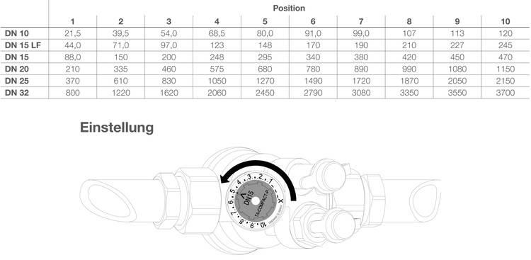 Für die Ermittlung der erforderlichen Durchflussmenge sind lediglich die Heizleistung des Einrohrrings und die Temperaturspreizung des Systems notwendig. Der entsprechende Einstellwert am Ventil kann anschließend einer Tabelle in den Produktunterlagen entnommen werden. Die Voreinstellung erfolgt schnell und einfach ohne Werkzeug am Voreinstell-Handrad. Das Ventil steht für Durchflussmengen von 21,5 bis 3.700 l/h und für Rohrdimensionen von DN 10 bis DN 32 zur Verfügung.