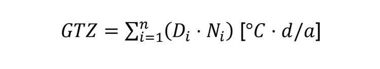 Die Gradtagszahl berechnet sich durch Aufsummieren der Produkte Di * Ni wobei Ni die Häufigkeit in Tagen, mit der eine Temperatur unterhalb der Heizgrenztemperatur Tgrenz innerhalb eines Jahres auftritt, beschreibt. Für Temperaturen unterhalb der Heizgrenztemperatur Tgrenz beschreibt Di die Differenz zwischen der Heizgrenztemperatur Tgrenz und der Normaußentemperatur DNorm.