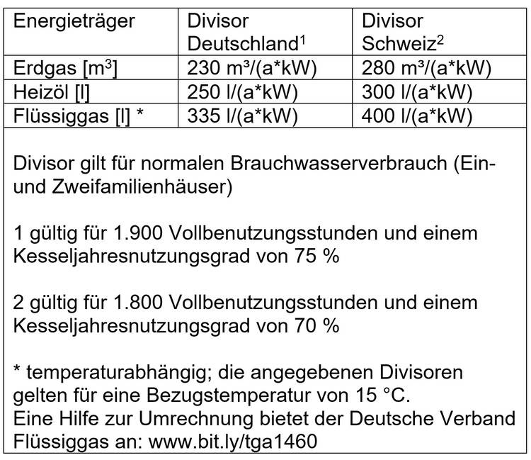 - Divisoren der Energieträger von Deutschland für den normalen Brauchwasserverbrauch von Ein- und Zweifamilienhäusern (für 1.900 Vollbenutzungsstunden und einen Kesseljahresnutzungsgrad von 75%). Diese sind notwendig, um den Energiebedarf zur Warmwasserbereitung nicht mit der Raumheizlast zu verrechnen.