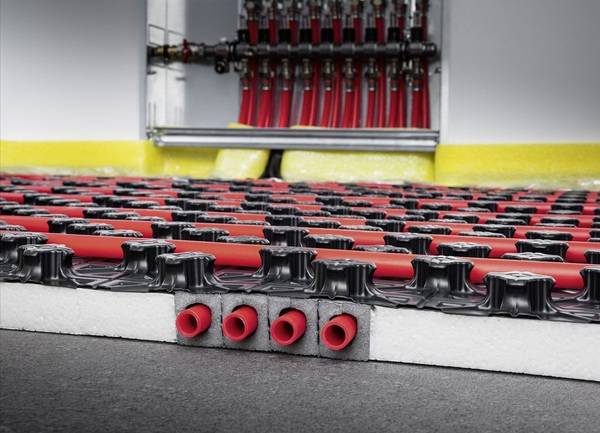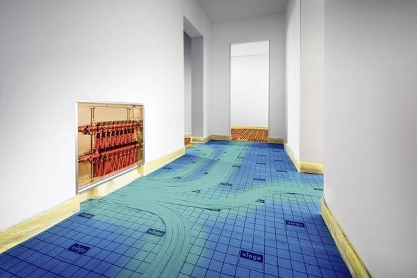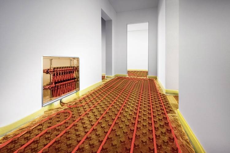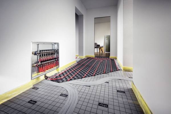 Mit neuen Komponenten für das Flächentemperiersystem Fonterra rückt Viega dem Überhitzungsproblem und der ungeregelten Wärmeabgabe in Transferräumen zu Leibe: Die Zuleitungen der Heizkreise werden in einem Dämmschlauch in der Dämmebene geführt.