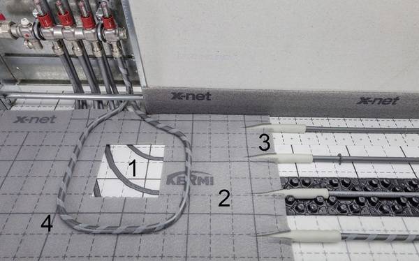 Statt durchlaufende Zuleitungen wie bisher üblich in den Estrich einzubetten, führt Kermi x-net connect sie ab dem Verteiler zunächst in eine Dämmebene unter dem Estrich. So wird die Heizwärme gezielt unter dem Estrich hindurchgeleitet und taucht erst dort wieder in die Estrichebene ein, wo der Fußboden tatsächlich erwärmt werden soll. Das verhindert eine ungewollte Wärmeabgabe über die Zuleitungen und minimiert auf diese Weise Energieverluste.