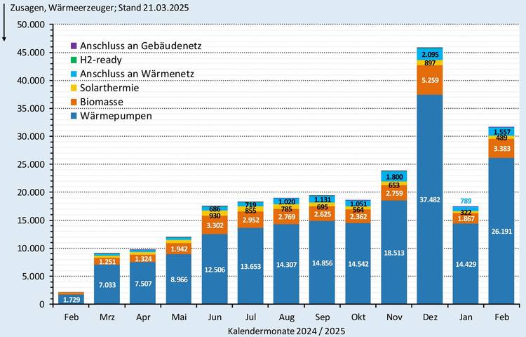 Bei den Zusagen gab es nach dem „Endspurt“ Ende 2024 im Januar 2025 zunächst eine Normalisierung und schon einen Monat später wieder eine deutlich gestiegene Nachfrage. Mit fast 31.000 Zusagen ohne Zusatzanträge liegt der Februar 2025 auf Platz 2. Spitzenreiter ist der Dezember 2024 mit fast 46.000 Zusagen. In welchem Umfang politische Aussagen und nationale wie auch globale politische Entwicklungen sowie Informationskampagnen der Wärmepumpenbranche die Nachfrage zuletzt geprägt haben, wird sich erst in den nächsten Monaten zeigen.