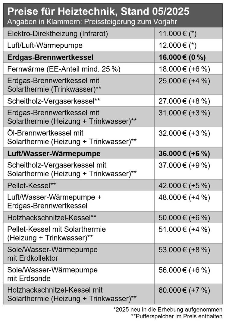 Im Jahr 2025 lagen je Heizungsart 74 bis 133 Rückmeldungen aus dem vergangenen Jahr vor. Daraus wurden für jede Heiztechnik Durchschnittspreise ermittelt. Alle Preise enthalten die Entsorgung des alten Wärmeerzeugers und den betriebsfertigen Anschluss der neuen Anlage (ohne neue Verrohrung und Heizflächen).