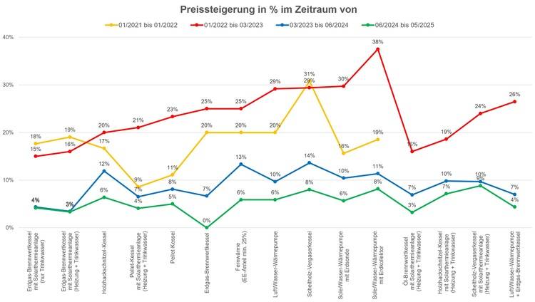 Die Preisentwicklung bei den Heiztechnologien seit Januar 2021 spiegelt die außergewöhnlichen Herausforderungen wider, mit denen sich die gesamte Heizungsbranche insbesondere am Anfang des Erhebungszeitraums konfrontiert sah.