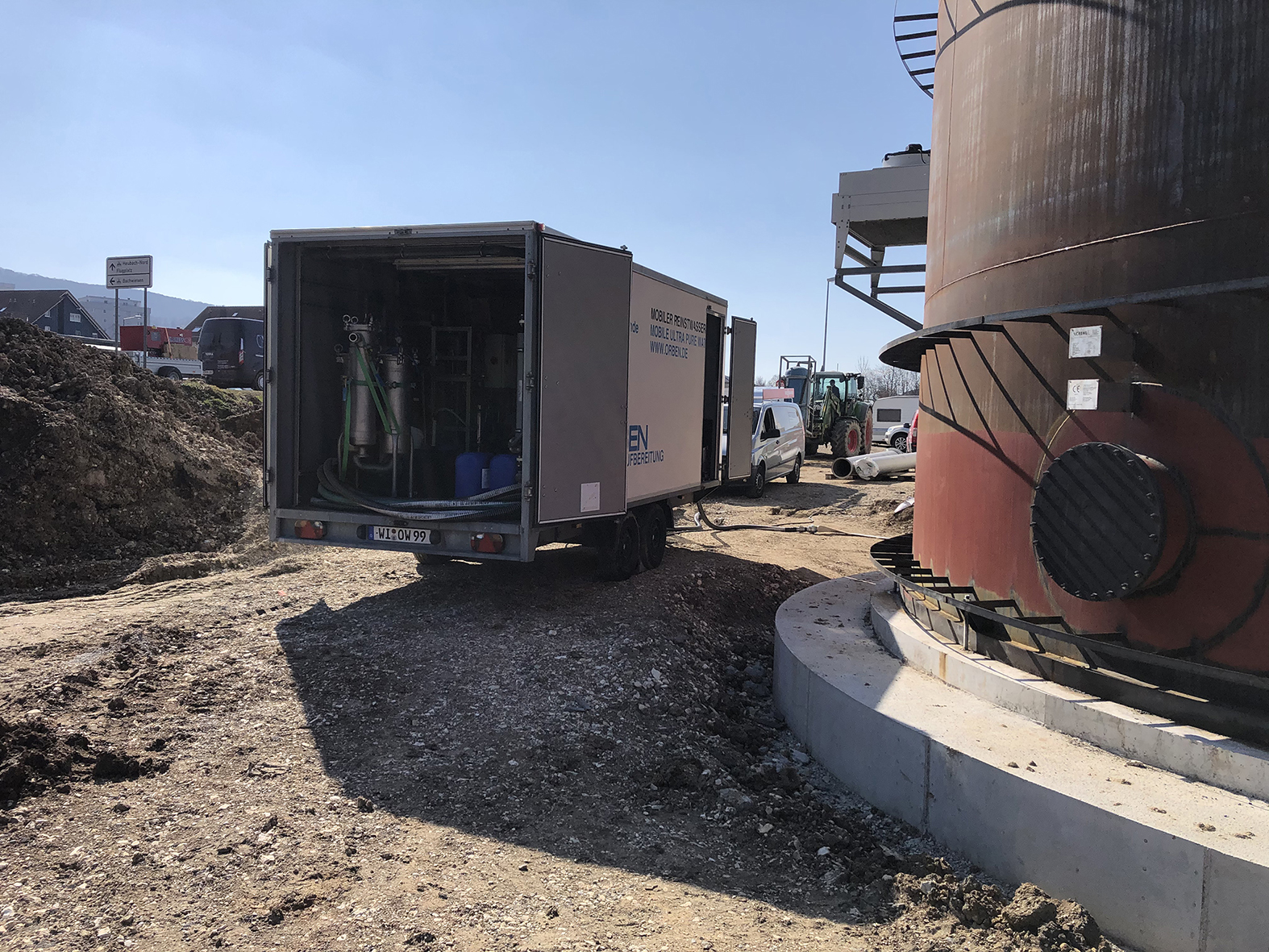 Da nicht ausreichend Speisewasser zur Verfügung stand, konnten nur etwa 7 m3 pro Stunde aufbereitetes Heizungswasser direkt in den neu erbauten Speicher eingefüllt werden. Die Befüllung erfolgte auf Kundenwunsch ausschließlich während der Geschäftszeiten an sieben bis acht Stunden pro Tag. Sie könnte aber auch problemlos rund um die Uhr erfolgen. Für einen Speicher in dieser Größenordnung würden das circa fünf bis sechs Tage inklusive Auf- und Abbau benötigen.