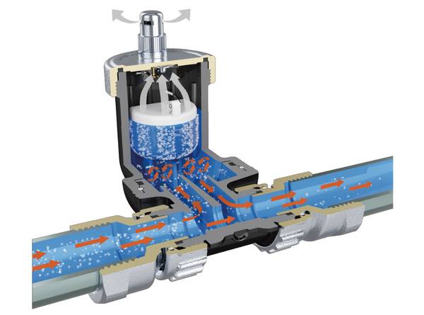 Durch die zweifache Strömung in der Kammer ist keine Fließrichtung vorgegeben. Somit kann etwa der neue, mit einem hygroskopischen Aquastopp ausgestattete Mikroblasenabscheider Discal Slim sowohl horizontal als auch vertikal in die Vorlaufleitung der Heizungsanlage oder des Wandheizkessels als Permanententlüfter eingebaut werden.