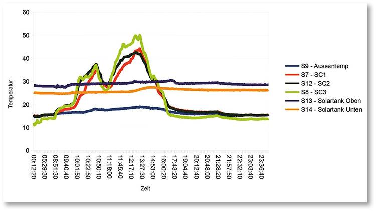 Die Solarernte (Kollektortemperaturen) im Beispiel 1 an einem kalten Herbsttag.