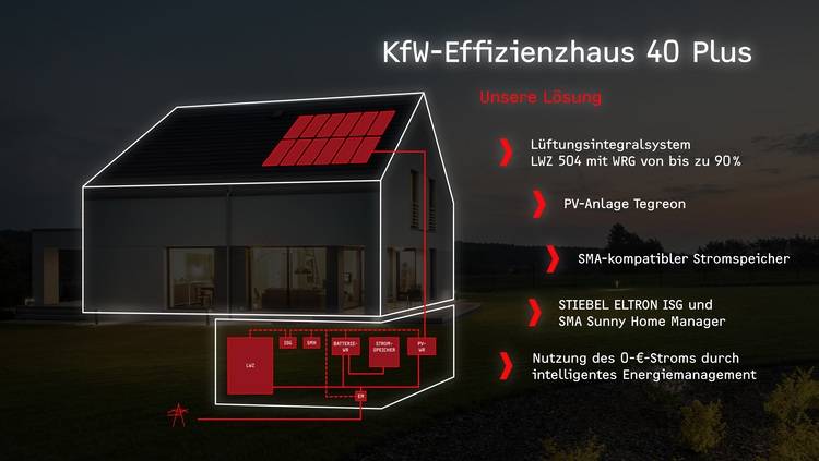 Mit dem Lüftungsintegralsystem LWZ 504 mit ISG und der Photovoltaikanlage „Tegreon“ von Stiebel Eltron sowie dem Sunny Home Manager von SMA sind drei Grundvoraussetzungen für ein KfW-40-Haus gegeben: