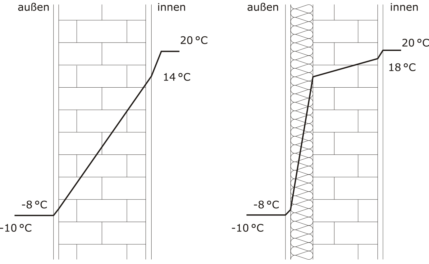 Was liegt also näher, als an jenen umschließenden Oberflächen des Raumes, dem Strom des Wärmedurchgangs (Transmission) entgegenzuwirken. An diesen Flächen entsteht das Wärmedefizit (Wärmegefälle), wie an den Flächen unseres Körpers, wenn wir frieren, sobald die Außentemperatur immer mehr fällt und sich zu große Temperaturdifferenzen zwischen äußerer Umgebung und Innenraum einstellen.