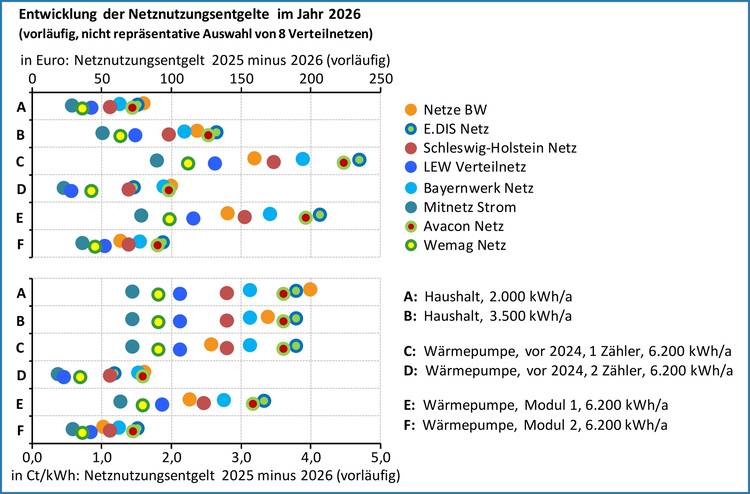 Das ermöglichet eine Vorschau, wie sich bei Standardlastprofil-Kunden (SLP, Haushaltskunden) das Netznutzungsentgelt (ohne Messstellenbetrieb) für das Jahr 2026 vor dem Hintergrund des Zuschusses von 6,5 Mrd. Euro zum Übertragungsnetzentgelt insgesamt entwickelt.