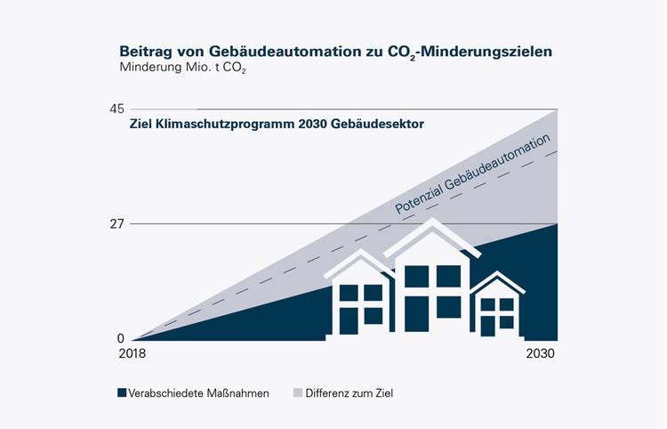 Mit den zum jetzigen Zeitpunkt verabschiedeten Maßnahmen im Gebäudesektor lassen sich 27 Mio. t CO2 bis 2030 einsparen – das sind 18 Mio. t weniger als das im Klimaschutzproramm festgelegte Ziel von 45 Mio. t CO2-Einsparung. Rund zwei Drittel der Differenz ließen sich durch den gezielten Einsatz von Gebäudeautomation ausgleichen. - Smart Home boomt in Deutschland
