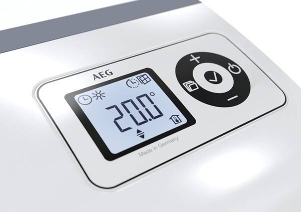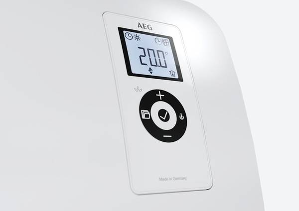 Mit Umsetzung der Öko-Design-Richtlinie 2018 hat AEG Haustechnik eine neue Produktgeneration moderner Raumheizgeräte geschaffen. Diese zeichnet sich durch gesteigerte Energieeffizienz zur CO2-Reduktion und Kosteneinsparung sowie einen verbesserten Wärmekomfort aus. Nahezu alle AEG Raumheizgeräte – also Speicherheizungen, Wandkonvektoren und Ventilatorheizer – sind nun mit einer einheitlichen elektronischen Regelung und einem einheitlichen Bedienelement ausgestattet. Über das flächenbündige Menüfeld mit drucksensitiven Tastern und beleuchtetem LC-Display mit gut ablesbarer Temperaturanzeige sind die Einstellungen ganz leicht vorzunehmen und jederzeit an persönliche Bedürfnisse anzupassen.