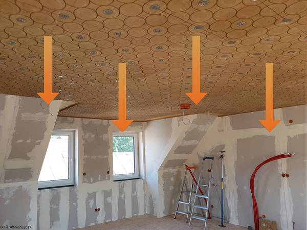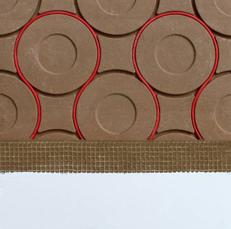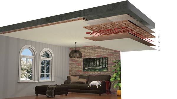 Der 230 Volt Heizstrom wird im zu beheizenden Raum im Niedrigtemperaturbereich von maximal 29°C zu 100% in Strahlungswärme umgewandelt. Hierfür wurde eine spezielle Lehm-Rillenplatte entwickelt, die im Trocken-Flächenpressverfahren an zwei Standorten in Deutschland produziert wird. Die patentierten Platten werden an der Decke befestigt. Durch Aneinanderlegen entsteht so eine Endlosmatrix, in die ein ebenfalls speziell entwickeltes Widerstandsheizkabel eingelegt wird. Abschließend wird die Decke mit Lehm verspachtelt und gestrichen. Das Heizmedium befindet sich so nur wenige Millimeter von der Oberfläche entfernt, eingebettet in einem sehr gut wärmeleitenden Lehm. Der Arbeitsaufwand ist überschaubar und die Montage kinderleicht. Der Aufbau des Modulsystems ist so angelegt, dass Elektrosmog erst gar nicht entstehen kann. Es bilden sich weder elektrische noch elektromagnetische Felder. Das wurde durch das VDE Prüf- und Zertifizierungsinstitut geprüft und bestätigt.