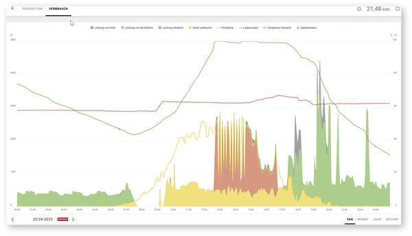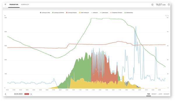 Eingangspunkt des Systems ist ein intelligenter Zähler (Smart Meter). Die Regelungen von Fronius und Ökofen kommunizieren miteinander und steuern die Energieflüsse nach Bedarf. Auf der Visualisierungs-App zeigt Zeitler den Verlauf an einem sonnigen Samstag im April und erklärt: „Am Morgen läuft der Stirling-Motor an. Dann kommt Solarstrom dazu, bis gegen Mittag die Batterie voll ist. Daraufhin wandert die Energie in den Heizstab, bis der Temperatur-Grenzwert des Pufferspeichers erreicht ist. Erst danach wird Strom ins Netz eingespeist.“