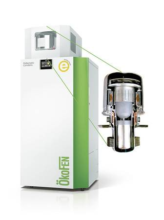 Bei der Strom erzeugenden Pelletsheizung Pellematic Condens_e von Ökofen ist ein Stirling-Motor über dem Brennwertkessel angeordnet. Das Arbeitsgas Helium im Stirling-Motor wird durch die Verbrennung der Pellets erhitzt und durch die Umspülung mit dem kalten Rücklauf der Heizung wieder abgekühlt. Durch diese Temperaturdifferenz dehnt sich das Helium aus und zieht sich wieder zusammen. Dabei entsteht eine Druckwelle, die den Arbeitskolben nach oben und unten bewegt. Der Verdrängungskolben drückt Helium durch den Generator vom Kopf zum Kühler. Die Feder am gegenüberliegenden Gehäuseboden drückt den Kolben wieder nach oben. Der Zyklus wiederholt sich 50-mal pro Sekunde. Der magnetische Arbeitskolben ist umgeben von der feststehenden Magnetspule mit Kupferwicklungen. Dadurch entsteht Wechselstrom.