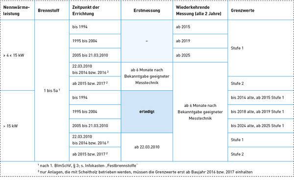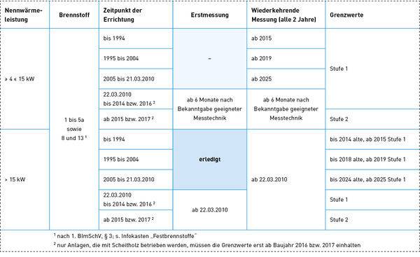 Neu errichtete, mechanisch beschickte Zentralheizungen müssen seit 1. Januar 2015 die anspruchsvollen Grenzwerte der Stufe 2 der Verordnung einhalten. Dazu zählen Anlagen, die mit Pellets oder Hackgut betrieben werden. Bei Heizungen, die von Hand mit Scheitholz und Kohle befeuert werden, greift die Stufe 2 erst ab dem Baujahr 2017. Für Zentralheizungen, die zum Zeitpunkt der Novellierung bereits eingebaut waren, gelten unterschiedliche Grenzwerte. Der Stichtag, ab dem diese Vorgaben eingehalten werden müssen, ist vom Alter der Anlage abhängig. Für Einzelraumfeuerstätten wie Kaminöfen, Kachelöfen, Grundöfen oder Herde gelten ebenfalls neue Anforderungen.