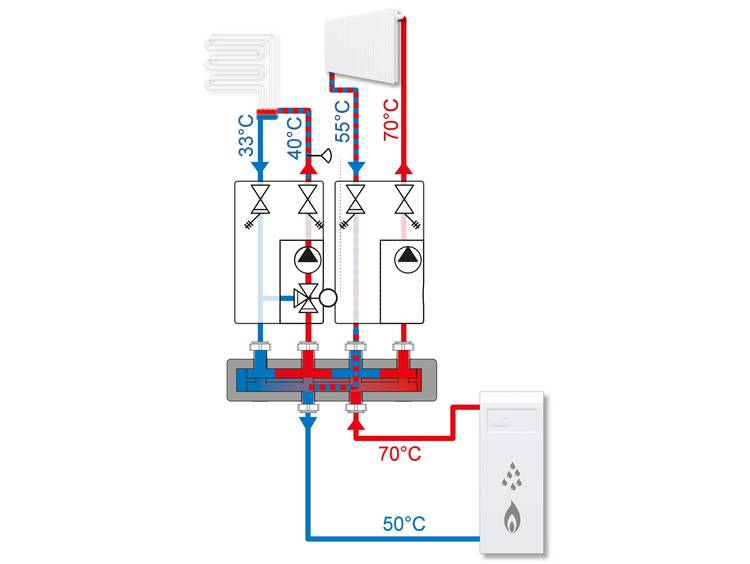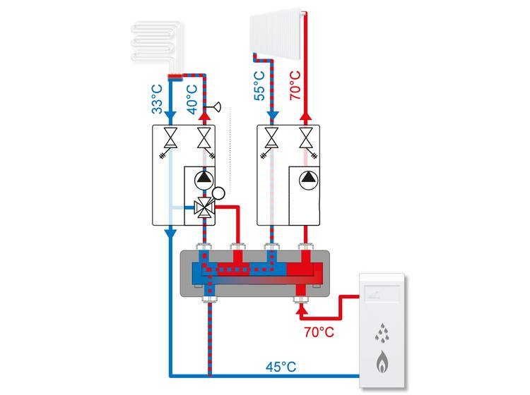 In der Regel ist die Rücklauftemperatur der Heizkörper ausreichend warm, um die Fußbodenheizung zu versorgen. Ist die Rücklauftemperatur der Heizkörper nicht ausreichend hoch oder ist der Volumenstrom des Heizkörperkreises zu gering, um den Fußbodenheizkreis ausreichend zu versorgen, stellt dies auch kein Problem dar.