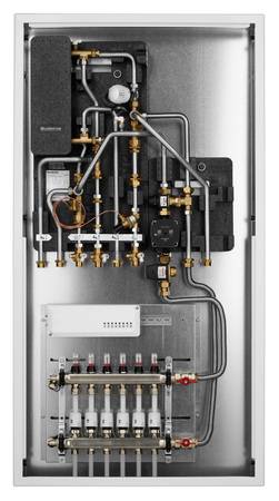 Speziell für den Neubau hat Buderus die Logamax kompakt WS160 entwickelt. Die Einbautiefe des Unterputzschrankes beträgt lediglich 15mm, in der langen Version finden der Heizkreisverteiler und auch die Regelungskomponenten der Fußbodenheizung Platz. Durch ihren modularen Aufbau eignet sich die neue Wohnungsstation für unterschiedliche Anwendungen: einen gemischten Heizkreis mit Fußbodenheizung, einen ungemischten Heizkreis mit Heizkörpern sowie als dezentrale Frischwasserstation ohne Heizkreis für den flexiblen Einsatz zum Beispiel in Vier-Leiter-Systemen mit einer Wärmepumpe.