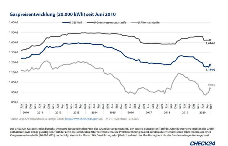 Beim Gaspreis ist die Preisdifferenz zwischen Grundversorgung und Alternativanbietern besonders groß. Für 20.000 kWh Gas zahlten Verbraucher im November 1.424 Euro. In den Alternativtarifen werden für die gleiche Menge Gas im Durchschnitt nur 940 Euro fällig (-34 Prozent).