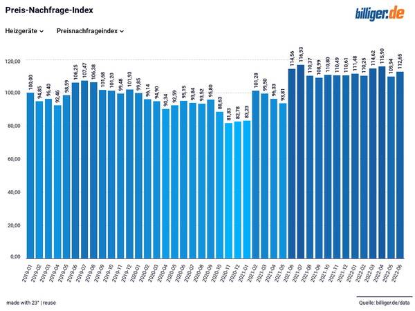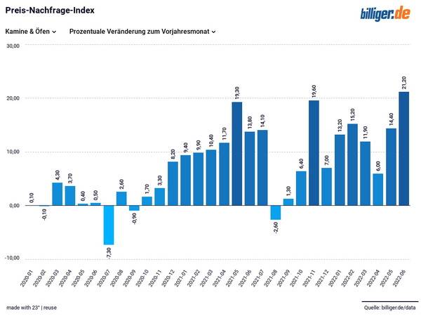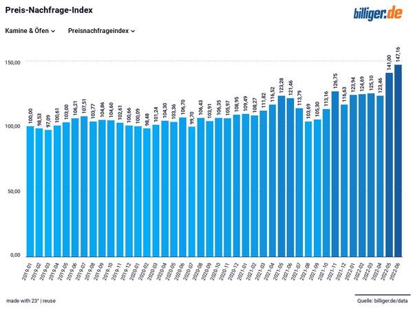 Das Preisvergleichsportal billiger.de hat Nachfrage und Preise analysiert. Bereits seit Mitte Juni haben die Experten eine massiv steigende Nachfrage nach Kaminöfen, Heizgeräten und entsprechenden alternativen Brennstoffen wie Holzpellets oder Holzbriketts festgestellt. Nun ist die Nachfrage nach diesen Produkten im Juli innerhalb einer Woche nochmals explodiert. Die Preise haben ebenfalls kräftig angezogen. Für Kaminöfen lag der Preis-Nachfrageindex bereits mit 147,2 um 21,2 Prozent über dem Vorjahresmonat. Im April lag er noch bei 123,5.