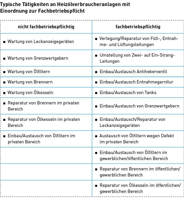 Die Fachbetriebsgrenze wurde bundesweit auf 1000 l vereinheitlicht. Seitdem dürfen bestimmte Tätigkeiten an Heizölverbraucheranlagen mit einem Volumen von mehr als 1000 l nur noch durch einen zertifizierten Fachbetrieb nach Paragraf 62 AwSV durchgeführt werden. Als das zu berücksichtigende Volumen im Sinne der AwSV zählt das auf dem Typenschild der Tankanlage angegebene Nennvolumen.