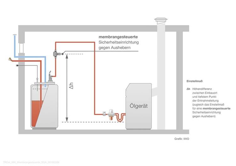 - Wenn Teile der Ölleitung unterhalb des maximal möglichen Füllstandes des Öltanks verlaufen, ist eine Sicherheitseinrichtung gegen Aushebern, ein sogenanntes Antiheberventil, einzubauen.