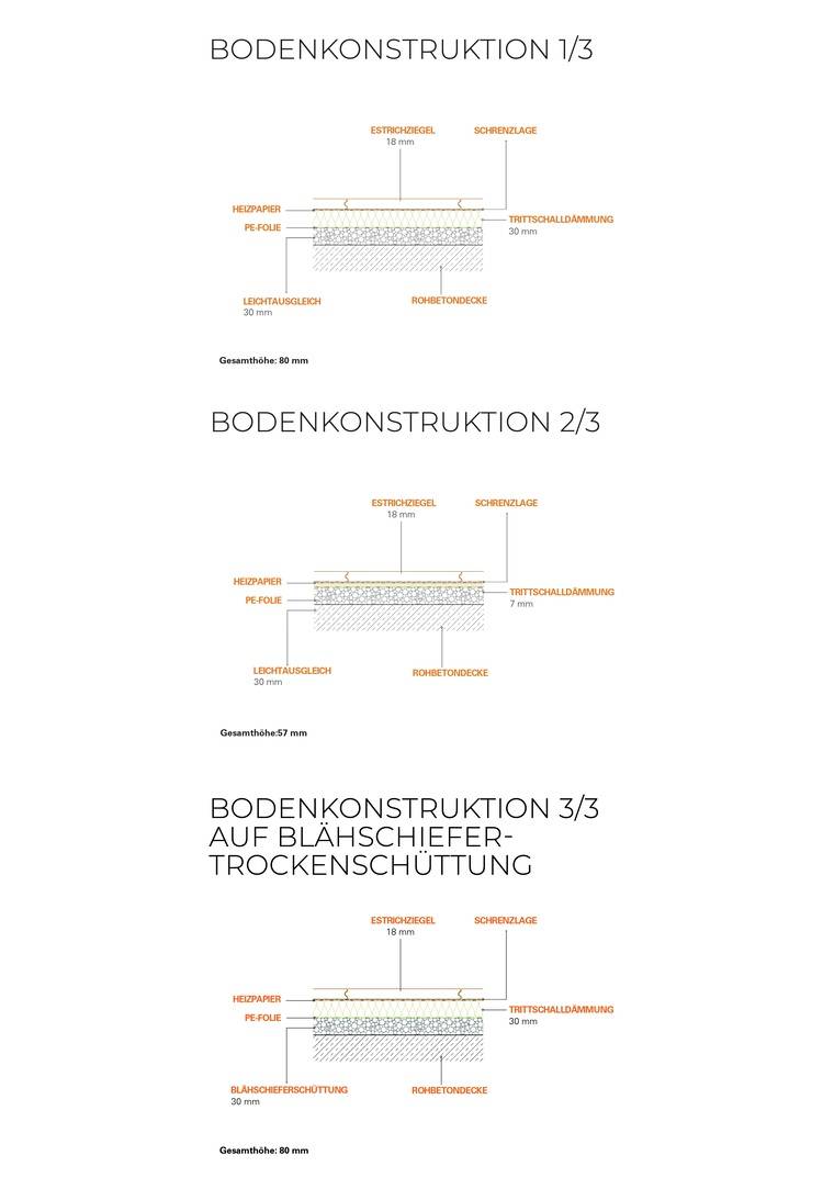Die Kombination aus Estrichziegel und Heizpapier verfügt zusammen nur über eine Aufbauhöhe von 18 Millimetern. Auf die Rohbetondecke wird zunächst eine 30 Millimeter starke Leicht-Ausgleichmasse oder alternativ eine Blähschiefer-Trockenschüttung aufgebracht. Gegebenenfalls sind hier Elektro- und Datenkabel sowie Wasserleitungen eingelegt. Es folgt eine mindesten 0,2 Millimeter starke PE-Folie. Je nach Anforderung kommt eine Trittschalldämmung von sieben oder 30 Millimetern zum Einsatz. Anschließend wird das Heizpapier verlegt.